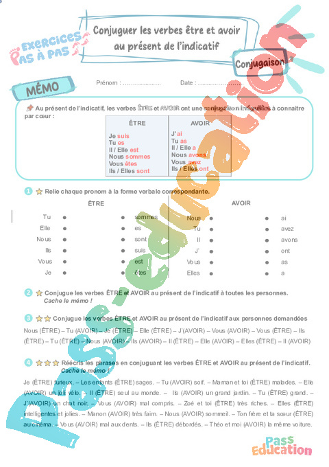 Exercices Pas à Pas avec mémo / leçon de conjugaison pour travailler la compétence : Conjuguer les verbes être et avoir au présent de l’indicatif au : 7eme Harmos .
