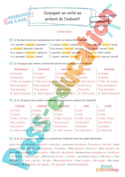 Correction Conjuguer un verbe au présent de l’indicatif : 5eme Harmos – Exercices Pas à Pas rtf