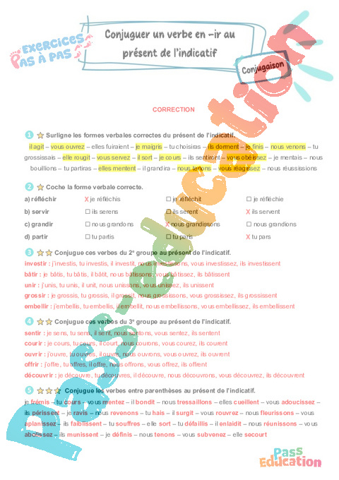 Correction Conjuguer un verbe en -ir au présent de l’indicatif : 7eme Harmos – Exercices Pas à Pas rtf