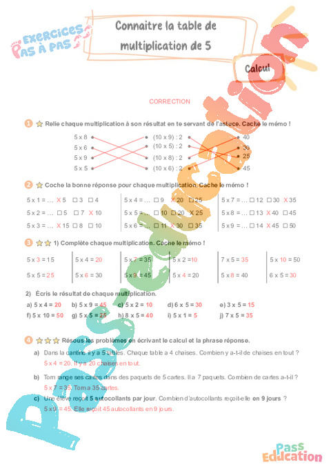 Correction Connaître la table de multiplication par 5 : 5eme Harmos – Exercices Pas à Pas pdf