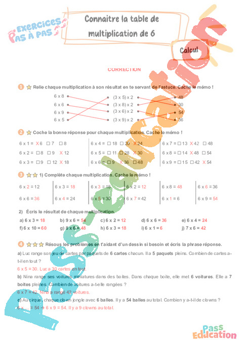 Correction Connaître la table de multiplication par 6 : 5eme Harmos – Exercices Pas à Pas rtf