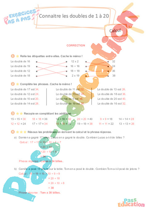 Correction Connaitre les doubles de 1 à 20 : 5eme Harmos – Exercices Pas à Pas pdf