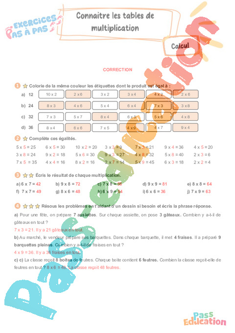 Correction Connaitre les tables de multiplication : 5eme Harmos – Exercices Pas à Pas pdf