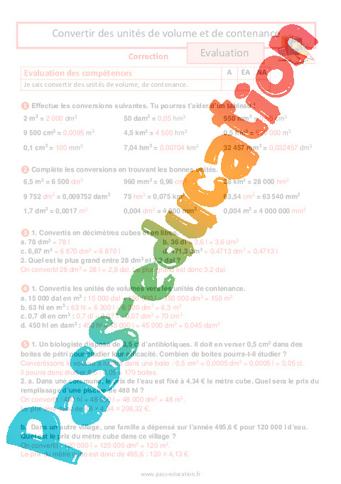 Evaluation avec la correction pour la 9eme Harmos sur convertir des unités de volume et de contenance.