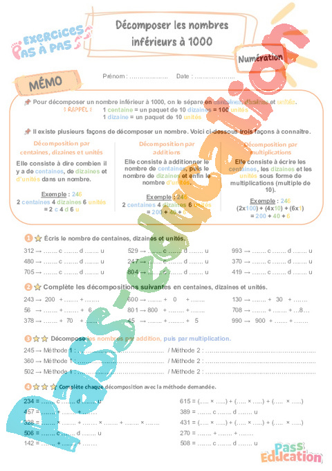 Exercices Pas à Pas avec mémo / leçon de numération pour travailler la compétence : Décomposer les nombres inférieurs à 1000 au : 5eme Harmos .