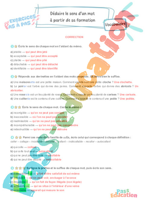 Correction Déduire le sens d’un mot à partir de sa formation : 7eme Harmos – Exercices Pas à Pas pdf