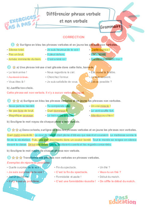 Correction Différencier phrase verbale et non verbala 7eme Harmos – Exercices Pas à Pas pdf