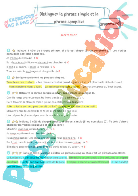Correction Distinguer une phrase simple et une phrase complexe : 7eme Harmos – Exercices Pas à Pas pdf