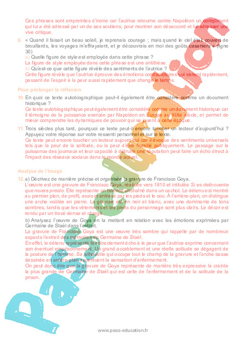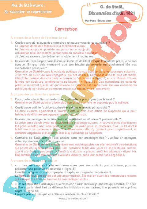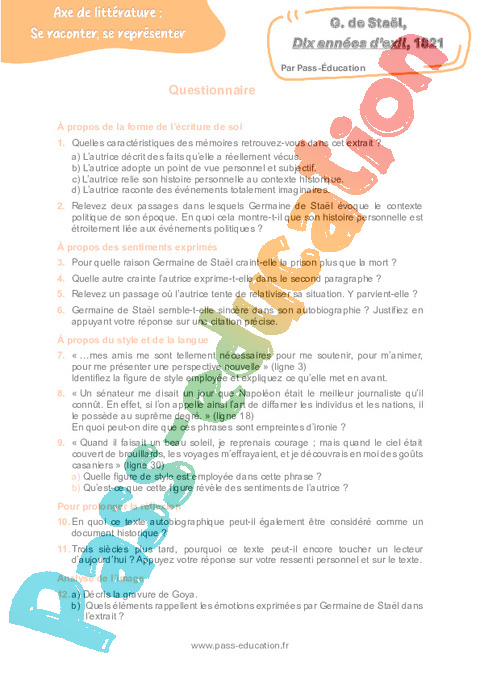 Correction Questionnaire Dix années d’exil (Germaine de Staël) : 11eme Harmos pdf