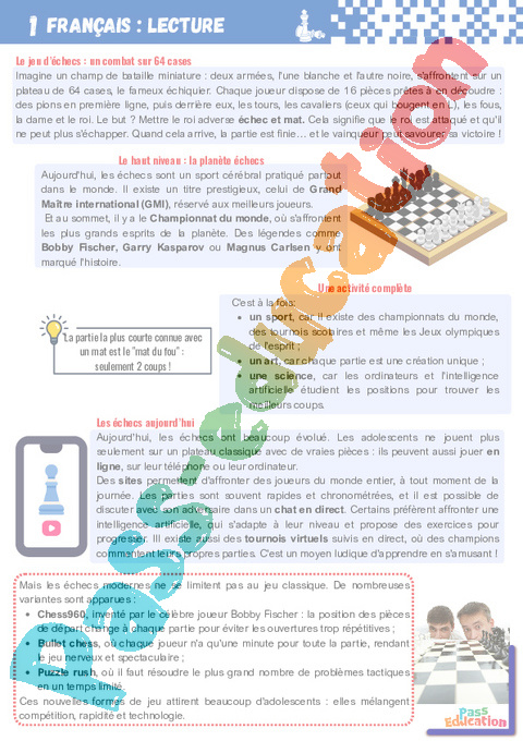 Français : Lecture – Le jeu d’échecs : un combat sur 64 cases