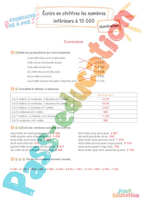 Correction Écrire en chiffres les nombres inférieurs à 10 000 : 5eme Harmos – Exercices Pas à Pas rtf