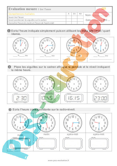 Evaluation – Grandeurs et Mesures : Lire l’heure