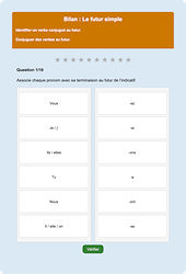 Cet exercice en ligne de conjugaison en Français s’adresse aux élèves de : 6eme Harmos () et porte sur le futur de l’indicatif des verbes du 1er et du 2e groupe. Les activités proposées permettent d’identifier les formes verbales au futur, d’associer pronoms et terminaisons, puis d’appliquer correctement les règles de conjugaison dans des phrases variées. L’entraînement favorise une compréhension progressive du temps du futur, développe l’autonomie et consolide les acquis essentiels pour écrire et s’exprimer avec précision, à l’école…