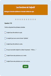 Cet exercice en ligne de français en : 6eme Harmos permet de comprendre et d’appliquer les fonctions de l’adjectif, en particulier l’adjectif épithète et l’adjectif attribut du sujet. À travers des situations variées et progressives, l’élève apprend à identifier l’adjectif, à analyser sa place dans la phrase et à vérifier les accords en genre et en nombre. Ce travail consolide les bases de la grammaire du et favorise une lecture attentive des phrases, utile aussi bien en classe qu’à la…