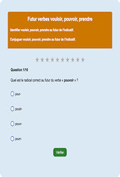 Cet exercice en ligne de conjugaison s’adresse aux élèves de : 4eme Harmos pour travailler le futur simple des verbes fréquents vouloir, pouvoir et prendre. À travers des situations proches du quotidien, les élèves apprennent à identifier le temps, à reconnaître les radicaux corrects et à appliquer les terminaisons du futur. Les activités favorisent une compréhension progressive, renforcent l’orthographe verbale et consolident les bases attendues à ce niveau, en classe comme à la maison.Objectifs de l’exercice en ligne autour du…
