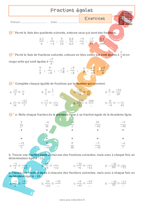 Exercices avec les corrigés pour la 10eme Harmos sur les fractions égales.