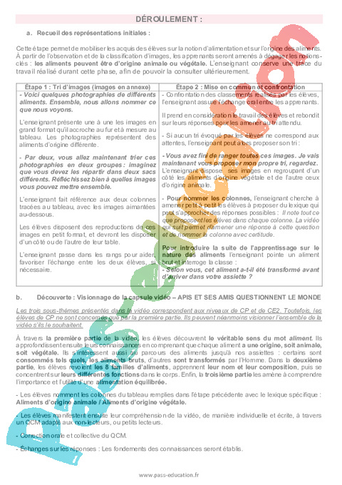 | – Voici quelques photographies de différents aliments. Ensemble, nous allons nommer ce que nous voyons. L’enseignant présente une à une les images en grand format qu’il accroche au fur et à mesure au tableau. Les photographies représentent des aliments d’origine différente. – Par deux, vous allez maintenant trier ces photographies en deux groupes : imaginez que vous devez les répartir dans deux sacs différents. Réfléchissez bien à quelles images vous pouvez mettre ensemble. L’enseignant fait référence aux deux colonnes tracées au tableau, avec les images aimantées au-dessous. Les élèves disposent des reproductions de ces images en petit format, et devront les disposer d’un côté ou de l’autre de leur table. L’enseignant passe dans les rangs pour aider, favoriser l’échange entre les deux élèves, si nécessaire. | – Confrontation des classements réalisés par les élèves, l’enseignant assure l’échange oral entre les apprenants. Il prend en considération le travail des élèves et rebondit sur leurs réponses pour les amener au tri attendu. – Si aucun tri évoqué par les élèves ne correspond aux attentes, l’enseignant peut alors proposer son tri : – Vous avez fini de ranger toutes ces images. Je vais maintenant vous proposer mon propre tri, regardez. L’enseignant dispose ses images en regroupant d’un côté les aliments d’origine végétale et de l’autre ceux d’origine animale. – Pour nommer les colonnes, l’enseignant cherche à amener petit à petit les élèves à proposer du lexique qui peut s’approcher des réponses possibles : Il note tout ce que proposent les élèves dans chaque colonne. La vidéo qui suit permet d’amener une réponse à cette question et de nommer la colonne avec certitude. Pour introduire la suite de l’apprentissage sur le nature des aliments l’enseignant pointe un aliment brut et interroge la classe : – Selon vous, cet aliment a-t-il été transformé avant d’arriver dans votre assiette ? |