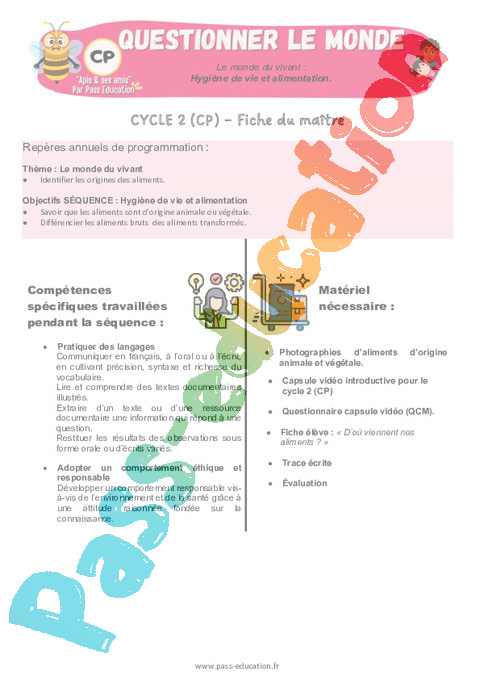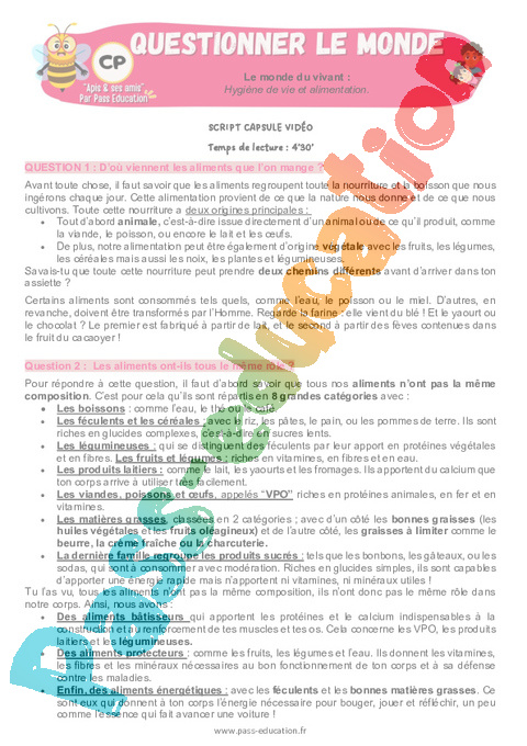 À travers la première partie de la vidéo, les élèves découvrent le véritable sens du mot aliment. Ils approfondissent ensuite leurs connaissances en comprenant que chaque aliment a une origine, soit animale, soit végétale. Ils s’intéressent aussi au parcours des aliments jusqu’à nos assiettes : certains sont consommés tels quels, les aliments bruts, d’autres sont transformés par l’Homme. Dans la deuxième partie, les élèves revoient les 8 familles d’aliments, apprennent leur nom et leur composition, puis se concentrent sur leurs différentes fonctions dans le corps. Enfin, la troisième partie les amène à comprendre l’importance et l’utilité d’une alimentation équilibrée.