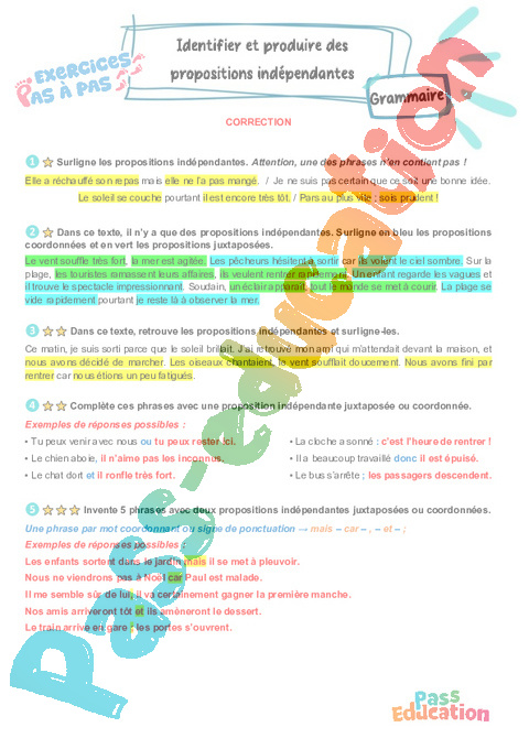 Correction Identifier et produire des propositions indépendantes : 7eme Harmos – Exercices Pas à Pas rtf