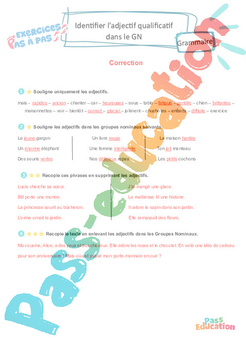 Correction Identifier l’adjectif qualificatif dans le GN : 5eme Harmos – Exercices Pas à Pas rtf