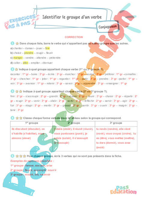 Correction Identifier le groupe d’un verbe : 7eme Harmos – Exercices Pas à Pas rtf