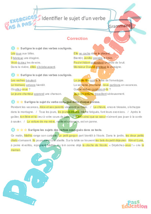 Correction Identifier le sujet d’un verbe : 5eme Harmos – Exercices Pas à Pas pdf