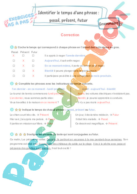 Exercices Pas à Pas avec mémo / leçon de conjugaison pour travailler la compétence : Identifier le temps d’une phrase : passé, présent, futur au : 5eme Harmos .