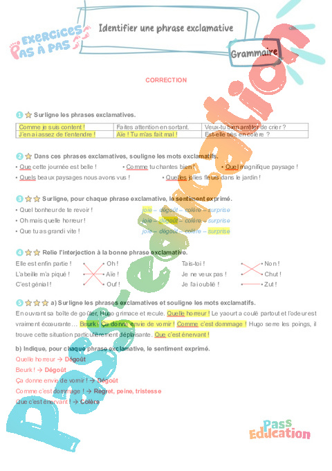 Correction Identifier une phrase exclamative : 7eme Harmos – Exercices Pas à Pas rtf