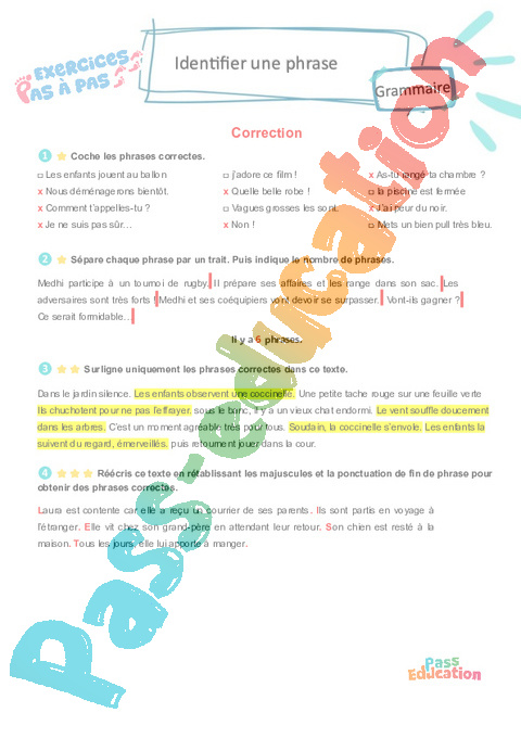Correction Identifier une phrase : 5eme Harmos – Exercices Pas à Pas pdf