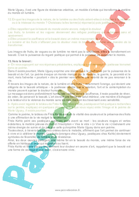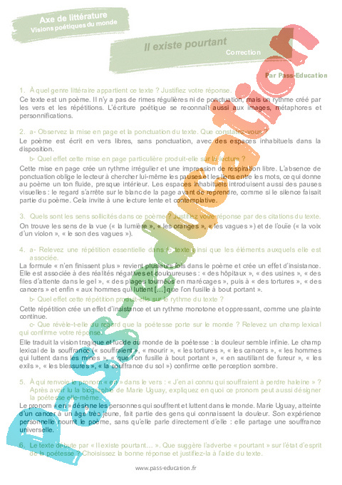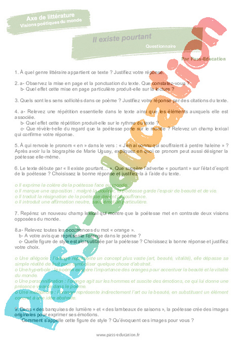 Correction Questionnaire Il existe pourtant (Marie Uguay) : 11eme Harmos pdf