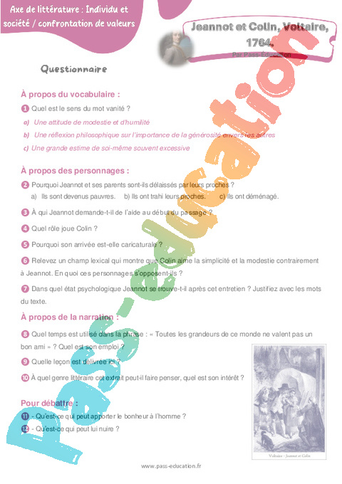 Questionnaire : 10eme Harmos Jeannot et Colin (Voltaire) pdf