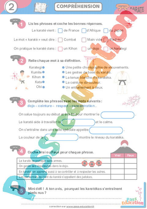 Relier chaque mot à sa définition : karategi, kihon, kata, kumite, obi.