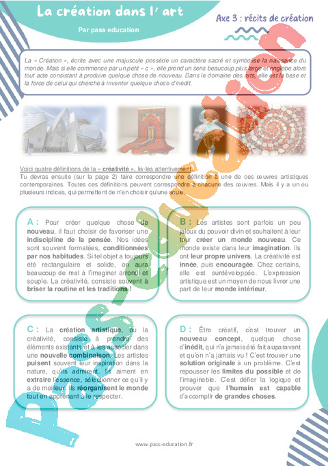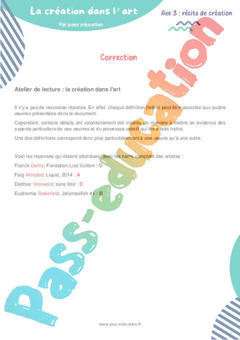 Correction Atelier de lecture La création dans l’art : 8eme Harmos pdf