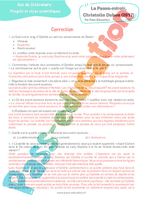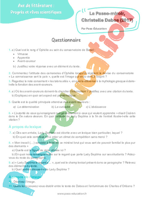 Correction Questionnaire La Passe-Miroir (Christelle Dabos) 2017 : 11eme Harmos pdf