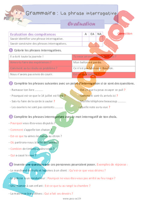 Correction Evaluation La phrase interrogative : 5eme Harmos pdf