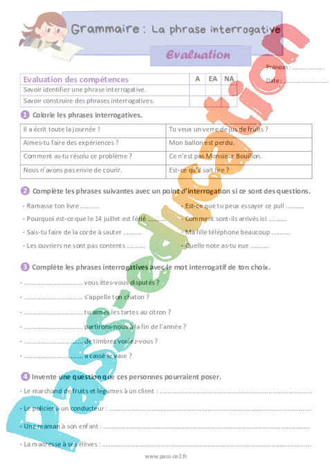 Évaluation de grammaire pour la 5eme Harmos sur la phrase interrogative.