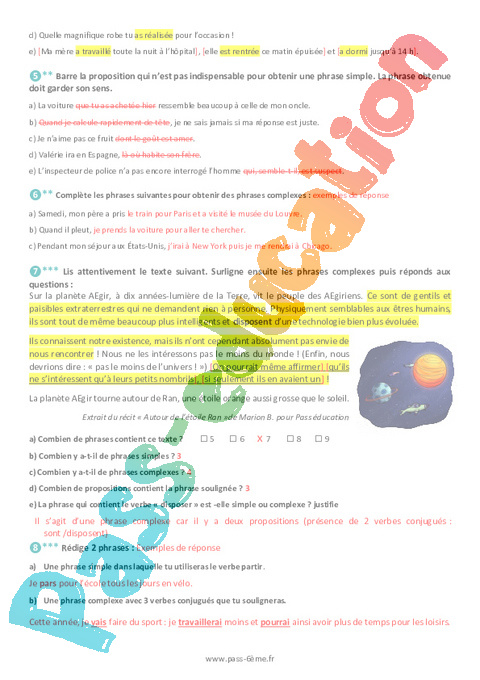 Correction Exercices La phrase simple et la phrase complexe 6ème pdf