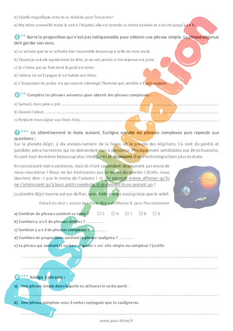 Exercices La phrase simple et la phrase complexe 6ème pdf