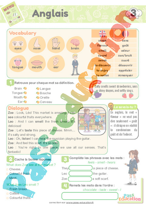 Lis le texte sur les 5 sens (vue, odorat, goût, toucher, ouïe) puis réponds aux questions.