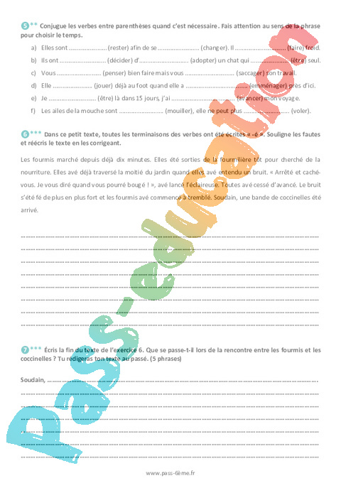 Les fourmis marché depuis déjà dix minutes. Elles été sorties de la fourmilière tôt pour cherché de la nourriture. Elles avé déjà traversé la moitié du jardin quand elles avé entendu un bruit. « Arrêté et caché-vous. Je vous diré quand vous pourré bougé ! », avé lancé l’éclaireuse. Toutes avé cessé d’avancé. Le bruit s’été fé de plus en plus fort et les fourmis avé commencé à tremblé. Soudain, une bande de coccinelles été arrivé.