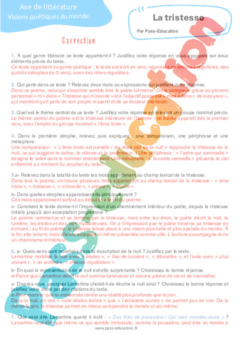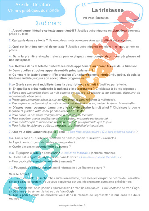 Correction Questionnaire La tristesse (Alphonse de Lamartine) : 11eme Harmos pdf