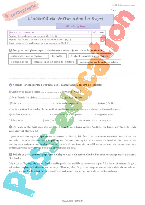 Evaluation 6ème L’accord du verbe avec le sujet pdf