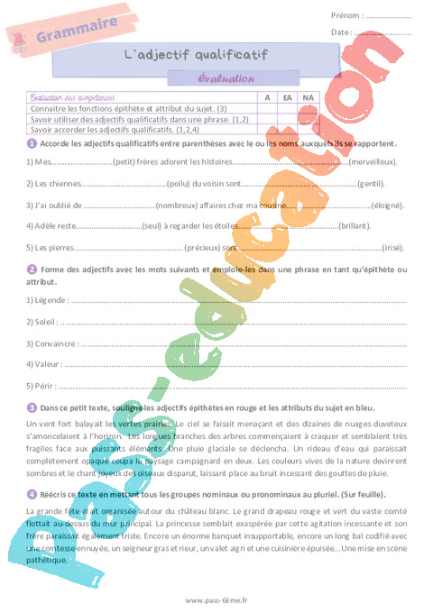 Evaluation L’adjectif qualificatif 6ème pdf