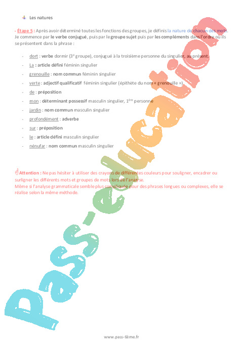 Attention : Ne pas hésiter à utiliser des crayons de différentes couleurs pour souligner, encadrer ou surligner les différents mots et groupes de mots lors de l’analyse.