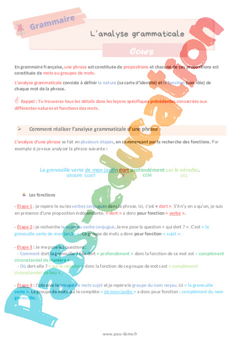 Cours de 6ème sur l’analyse grammaticale.