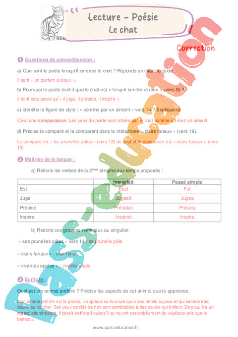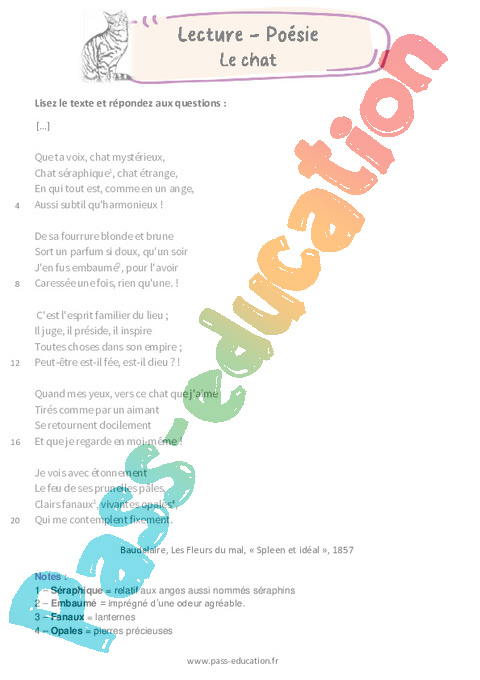 La poésie Le chat est un texte composé d’un ensemble de strophes de quatre vers. Des décasyllabes alternent avec des octosyllabes. L’analyse de la poésie permet à l’élève de
