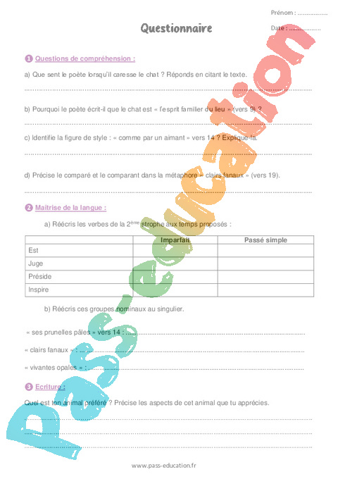 La fiche sur la poésie Le chat de Charles Baudelaire est accessible en téléchargement. Les élèves sont invités à répondre à des questions de compréhension sur le texte. Grâce aux questions, la signification des formules métaphoriques est mise au jour.