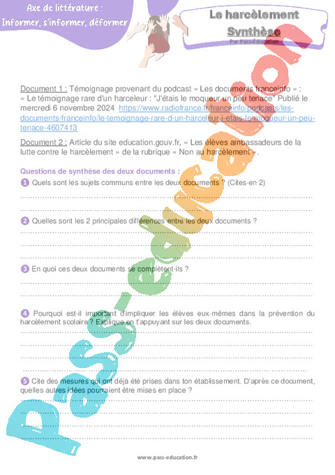 Synthèse Le harcèlement : 10eme Harmos pdf