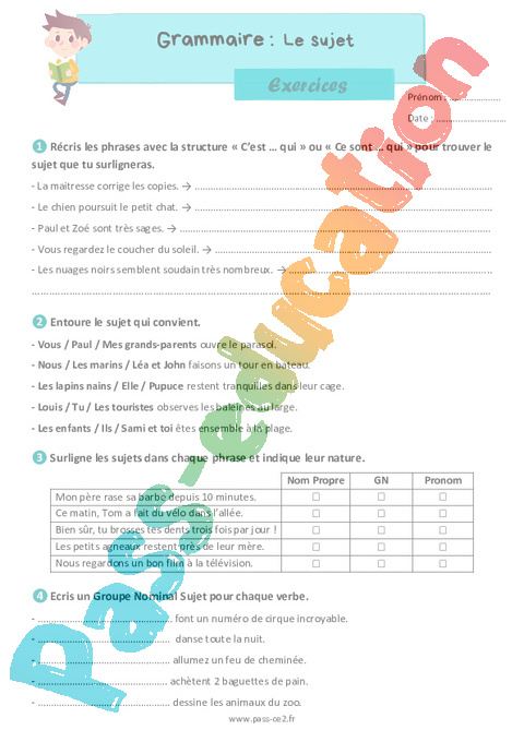 - Le sujet désigne la personne, l’animal ou l’objet qui fait l’action exprimée par le verbe.