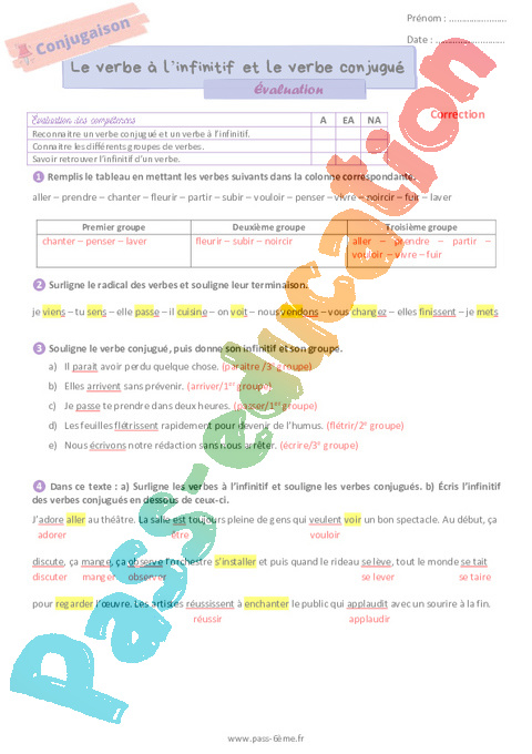 Correction evaluation Le verbe à l’infinitif et le verbe conjugué 6ème pdf